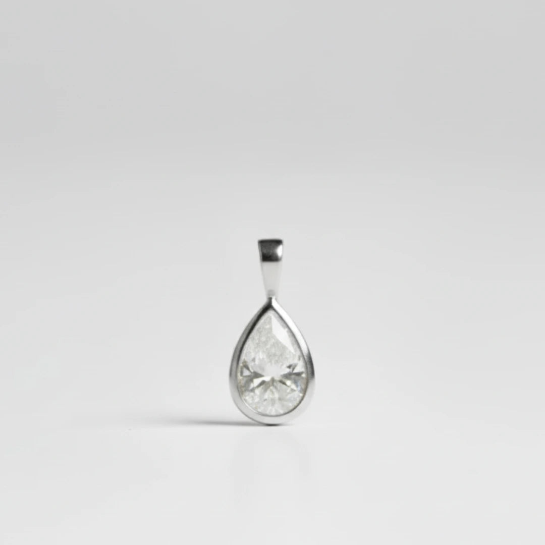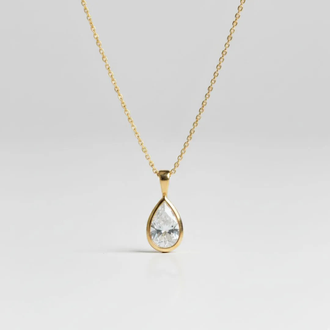 Este elegante dije de diamante pera presenta una montura bisel en oro de 14K, realzando el brillo natural de la piedra. Su diseño atemporal es perfecto para combinar con tu cadena favorita, añadiendo un toque de sofisticación a cualquier look.