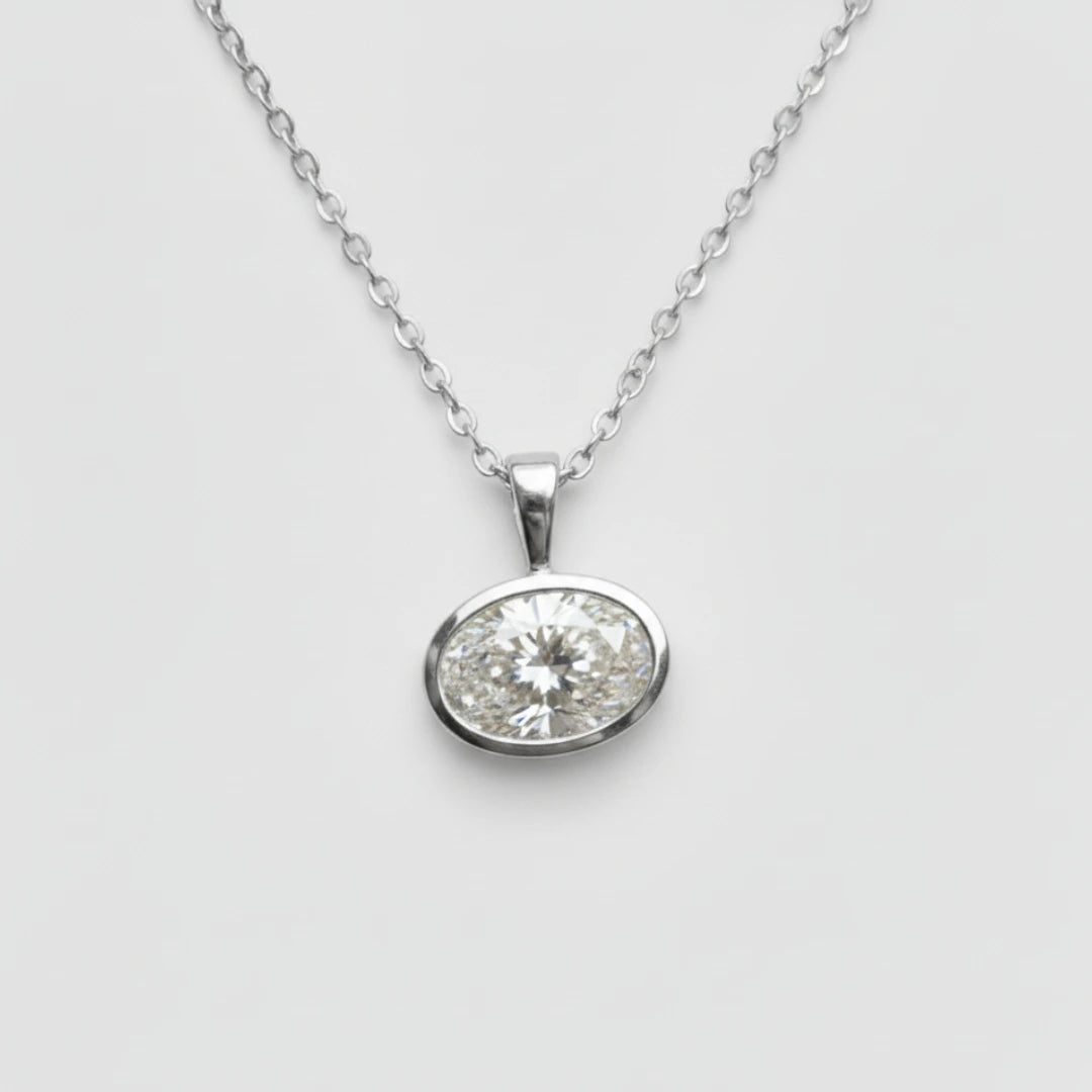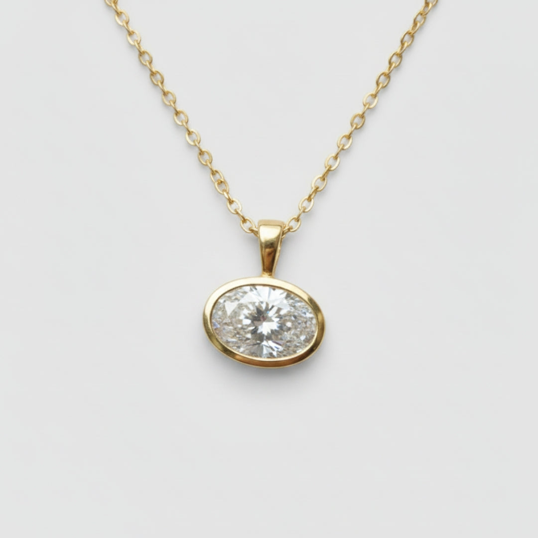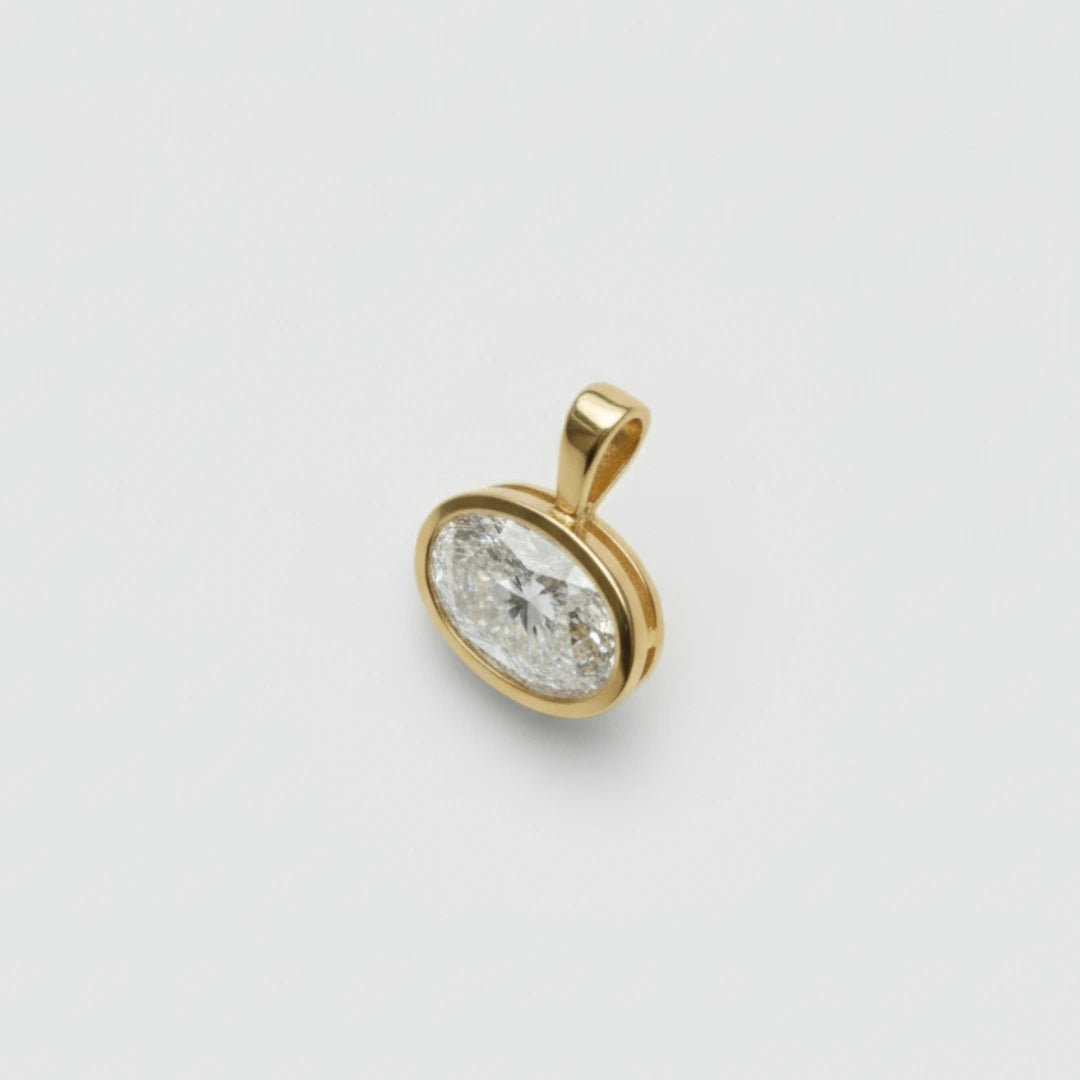 Este elegante dije de diamante ovalado presenta una montura bisel en oro de 14K, realzando el brillo natural de la piedra. Su diseño atemporal es perfecto para combinar con tu cadena favorita, añadiendo un toque de sofisticación a cualquier look.